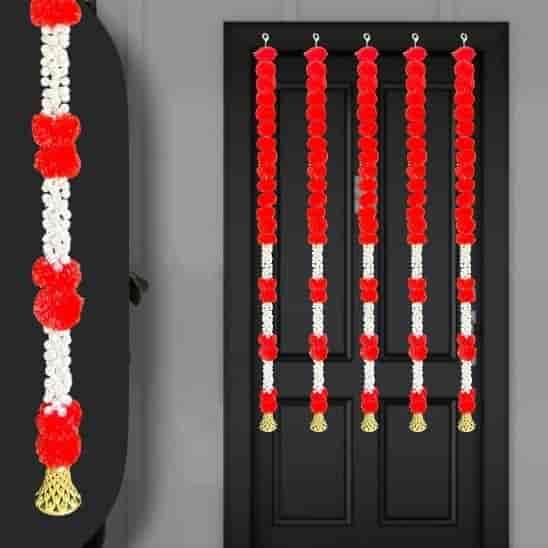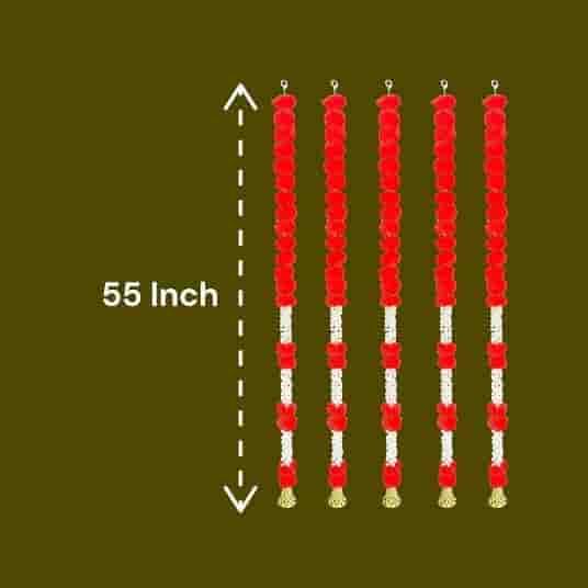 Go24shopping Handmade Artificial Fluffy Marigold with Jasmine Flower Garland with a Golden Bell at The Bottom Used for Decoration, Colour Red, Pack of 10