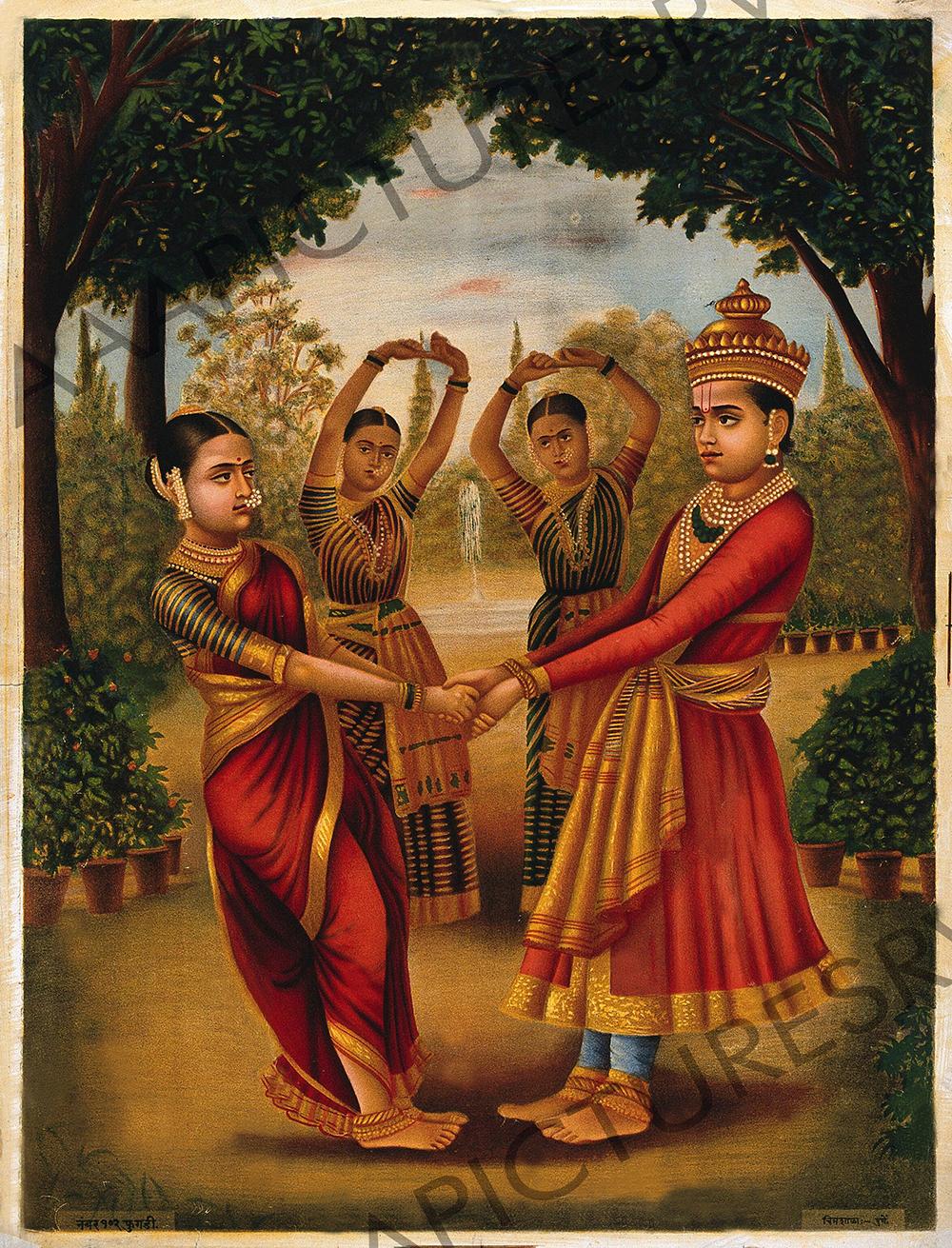 2 A girl and boy dance in a garden. Chromolithograph by an Indian artist, 1800s.