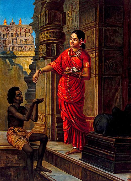 3 A woman giving alms to a beggar outside a temple to Lord Shiva. Chromolithograph by R. Varma.