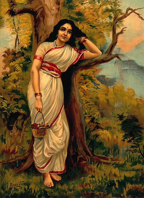 Ahalya leaning on a tree. Chromolithograph by R. Varma.