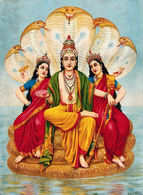 Vishnu flanked by two wives resting on Shesa, the serpent on the waters. Chromolithograph by R. Varma