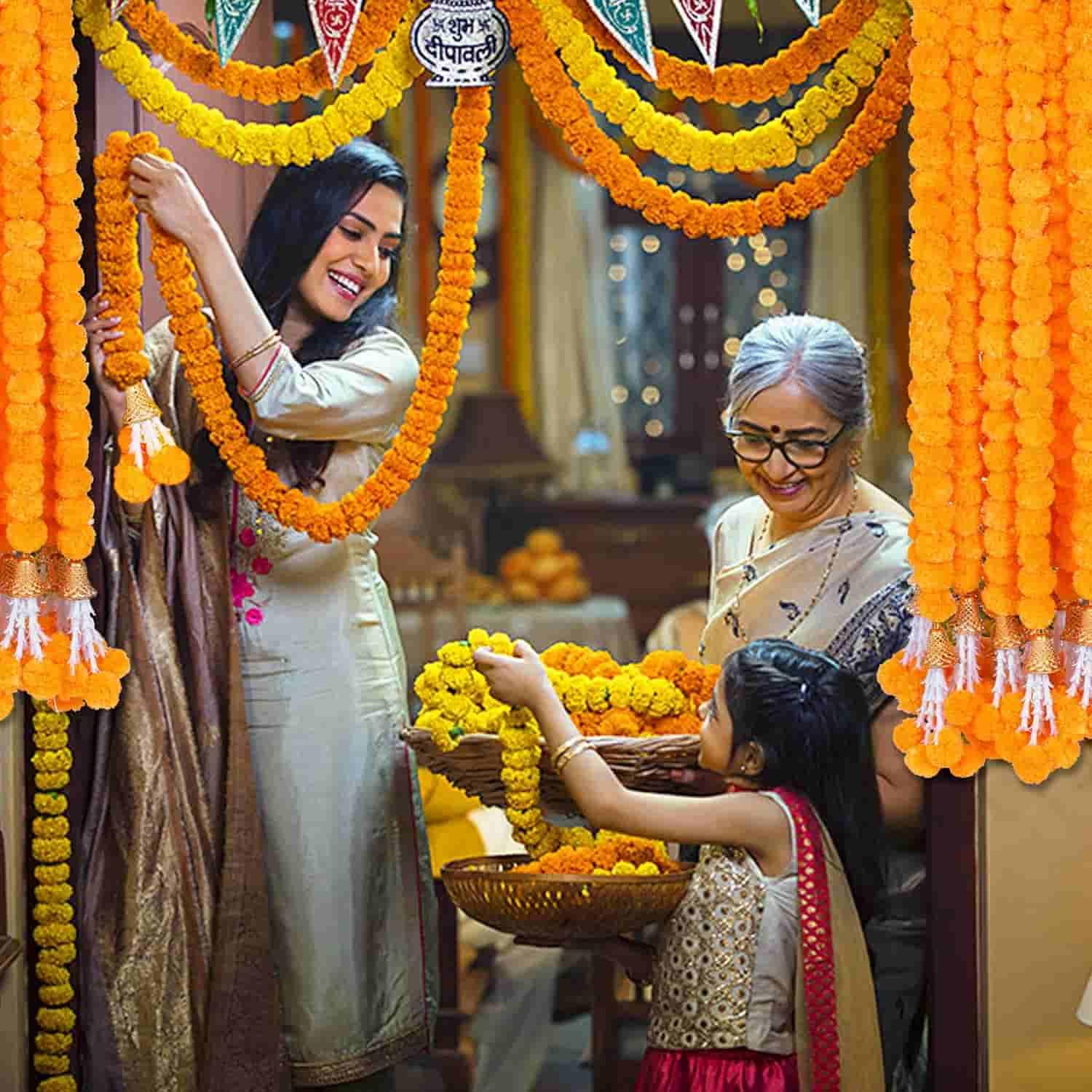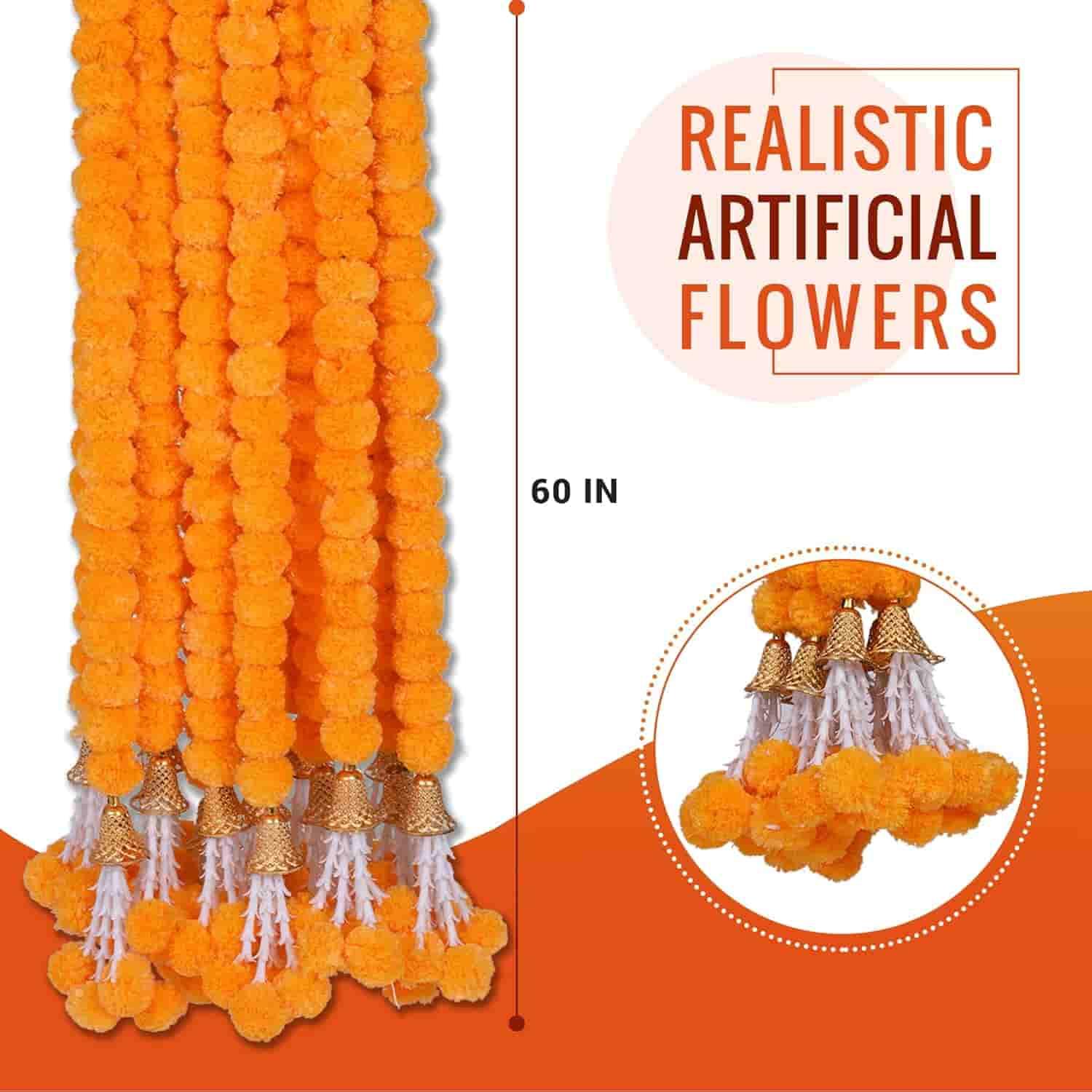 included components: each pack contains 10 strings of 5 feet long artificial marigold garland with premium looking bells and rajnigandha strings