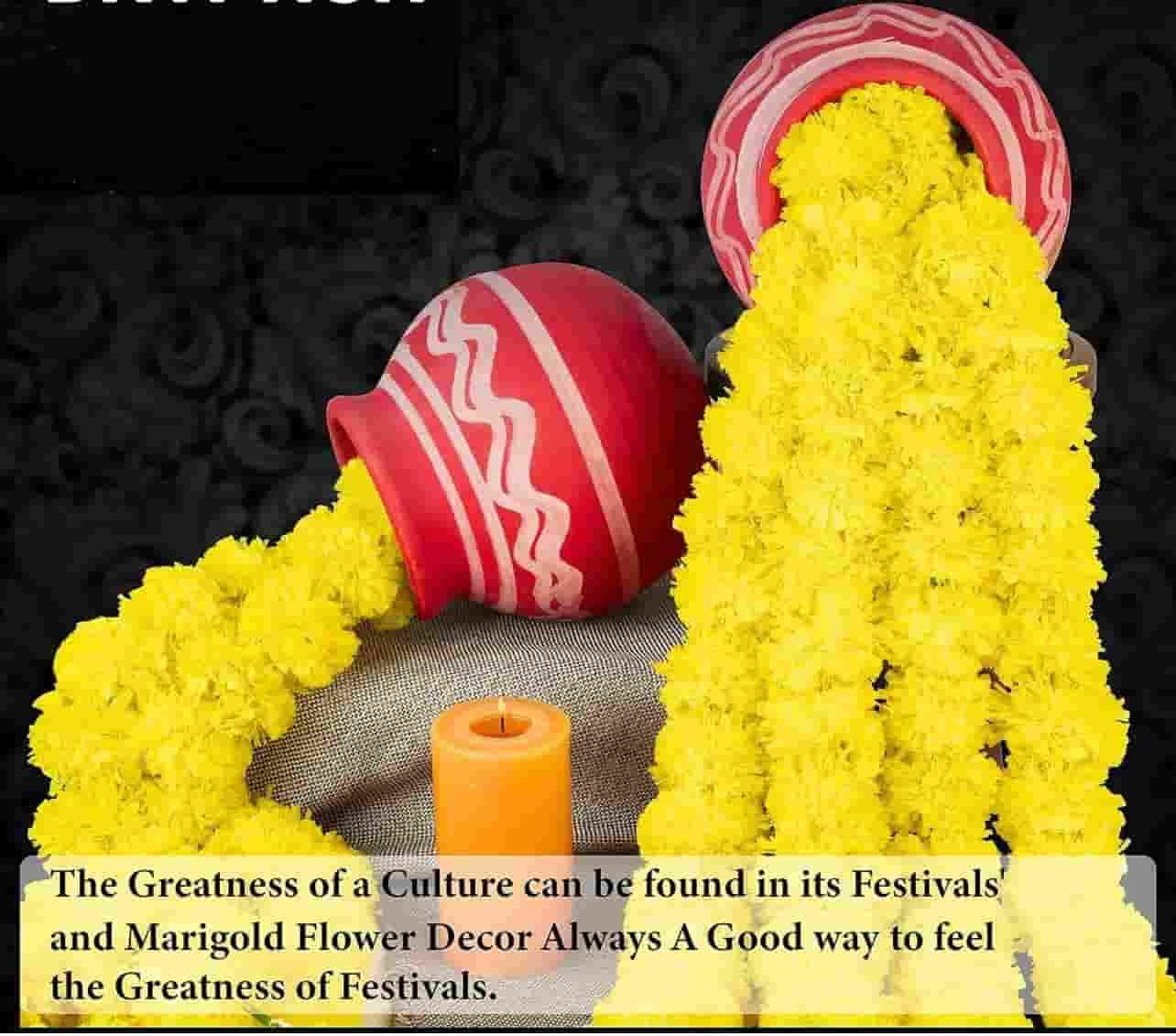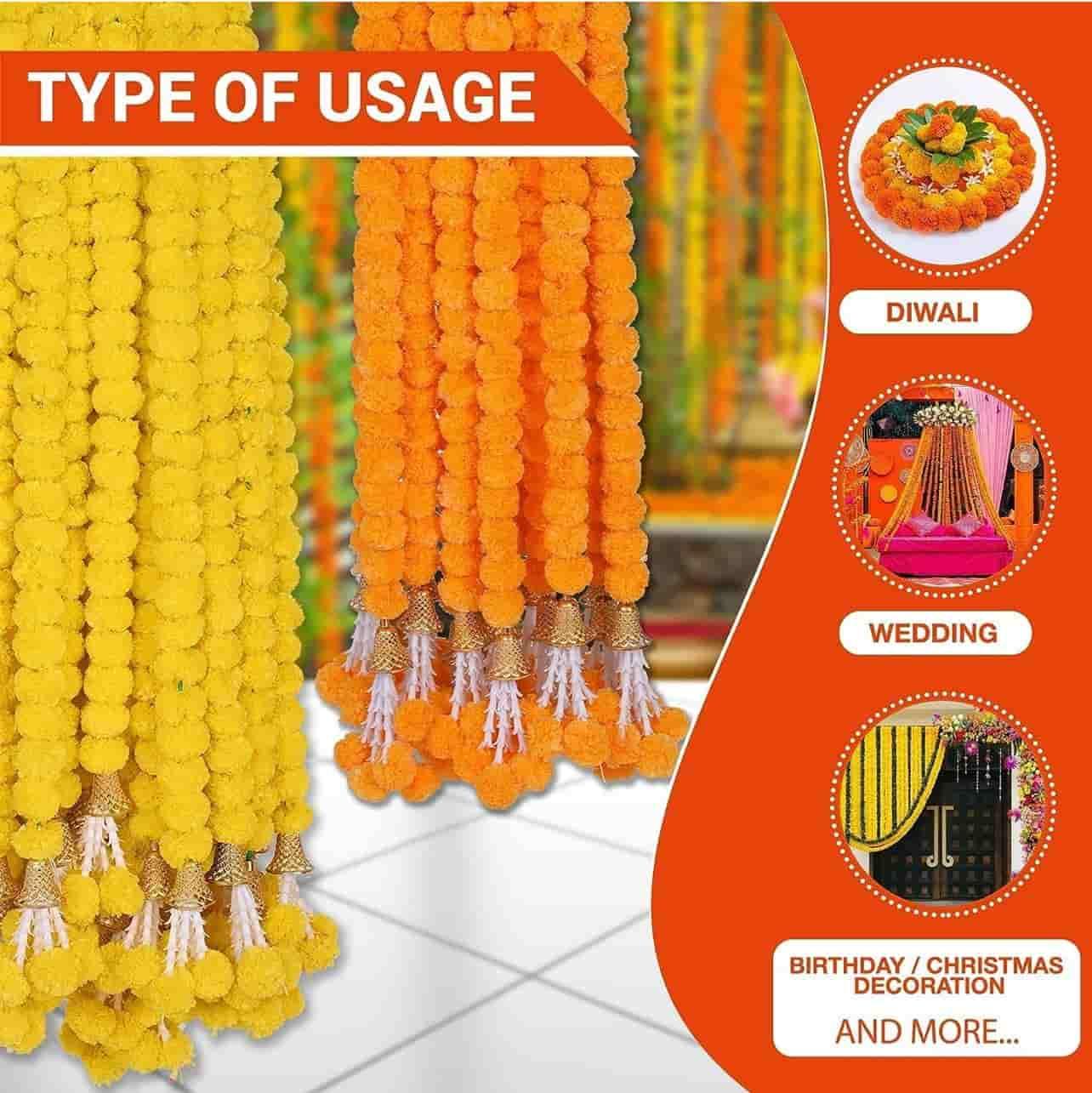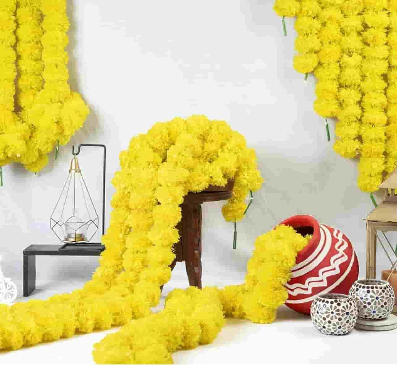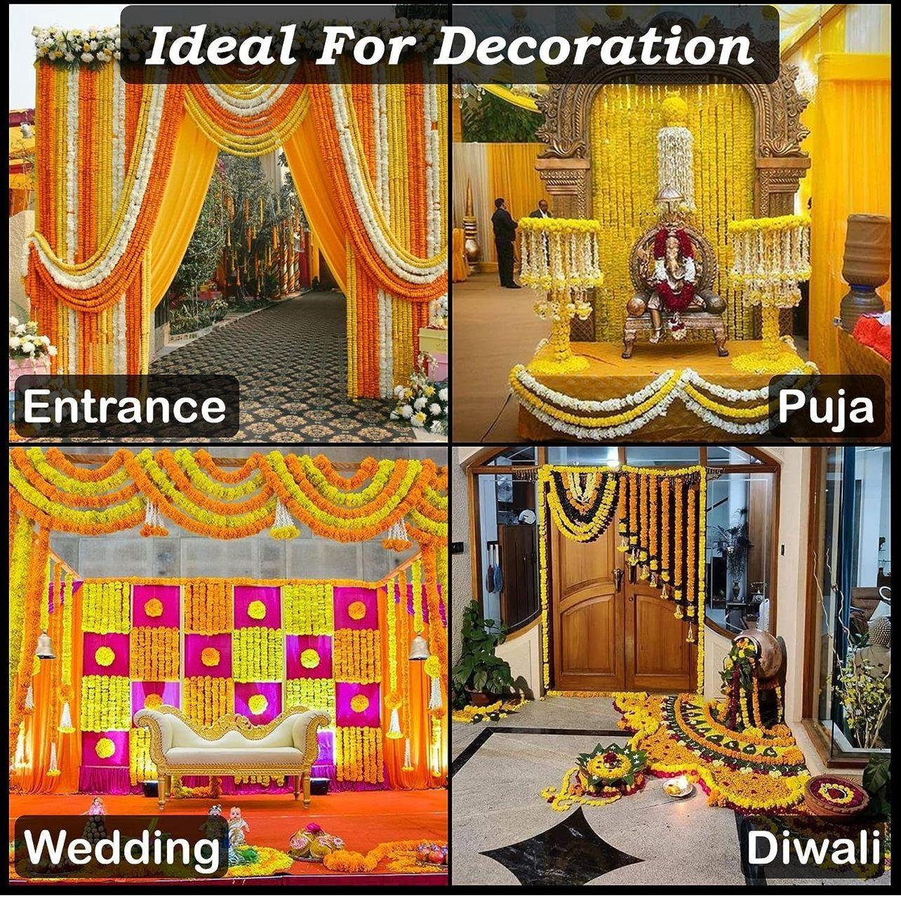 multipurpose garland flowers for decoration: perfect for home entrances, doors, walls, balconies, temples, and stage backdrops, these marigold flower garlands are versatile enough for any setup. the combination of yellow and orange flower decoration strands creates a harmonious blend of traditional aesthetics with vibrant charm for wall hanging decor, flower hanging for decoration, artificial flower, decoration flower, haldi decoration items, garlands for home decoration, flowers for decorations backdrop, hanging decoration items, ganesh chaturthi decoration setup, ganesh decoration items for home, ganesh chaturthi decoration.