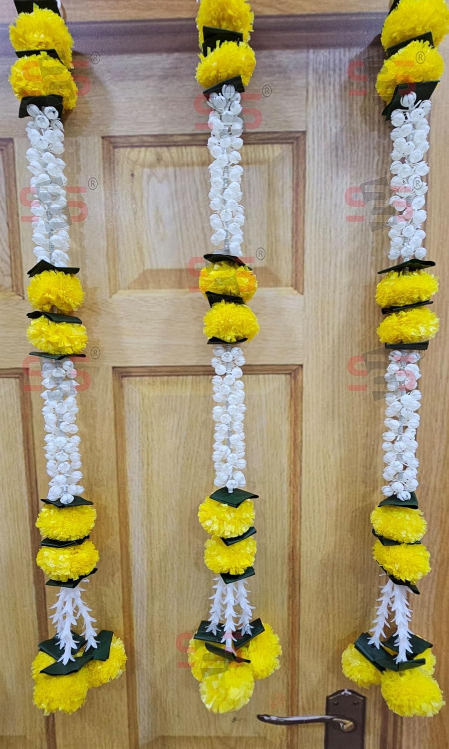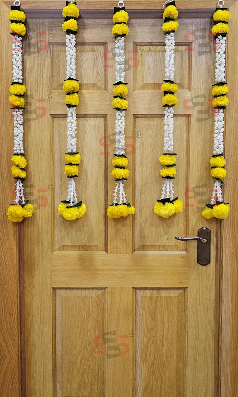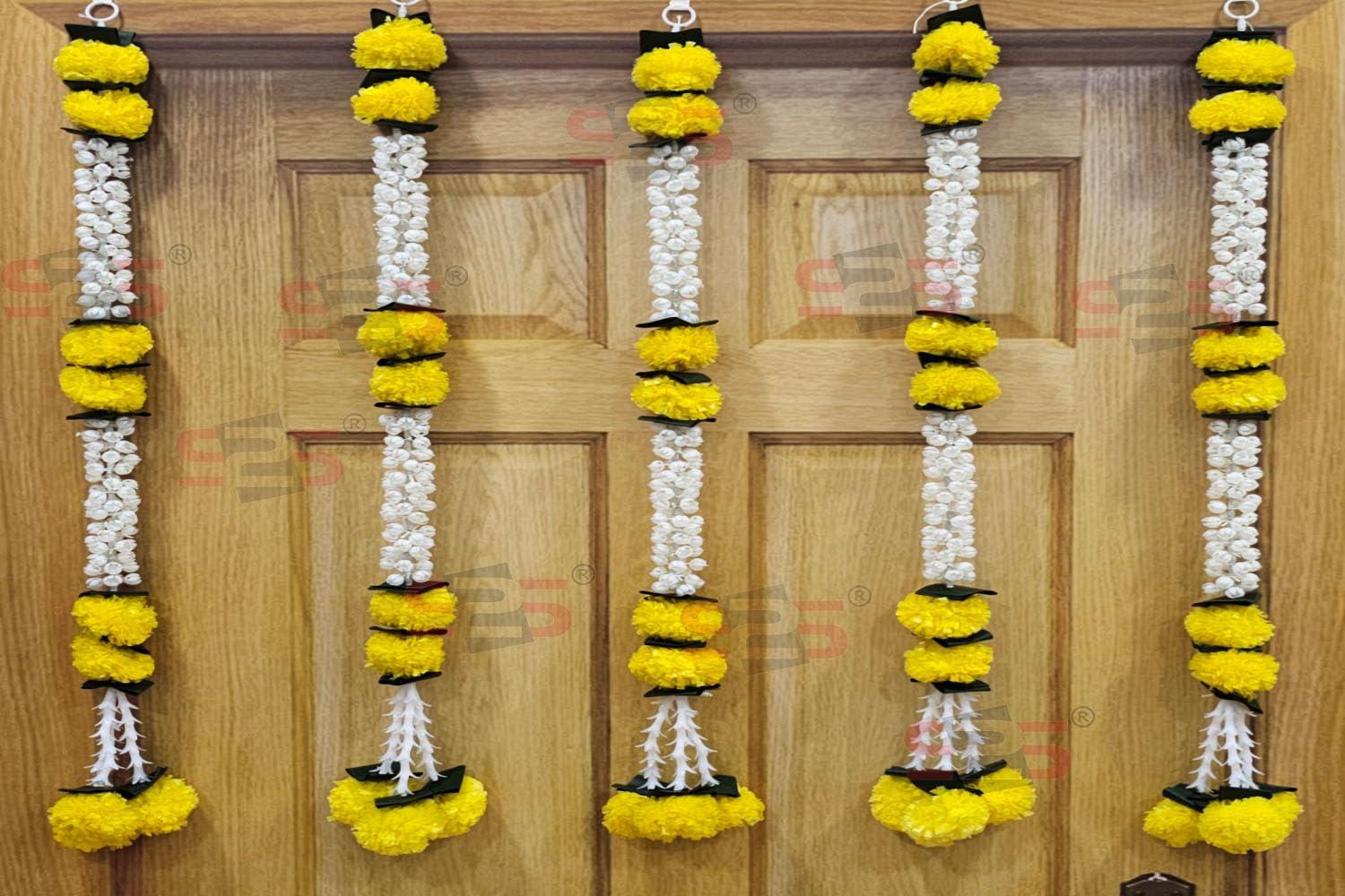 Go24shopping artificial plastic marigold jasmine, mogra flower, green leaves tassels garlands ladi strings for decoration of home, balcony, wall hangings, hall|pack Of 5|(height-30 inch) (mogra yellow flowers)