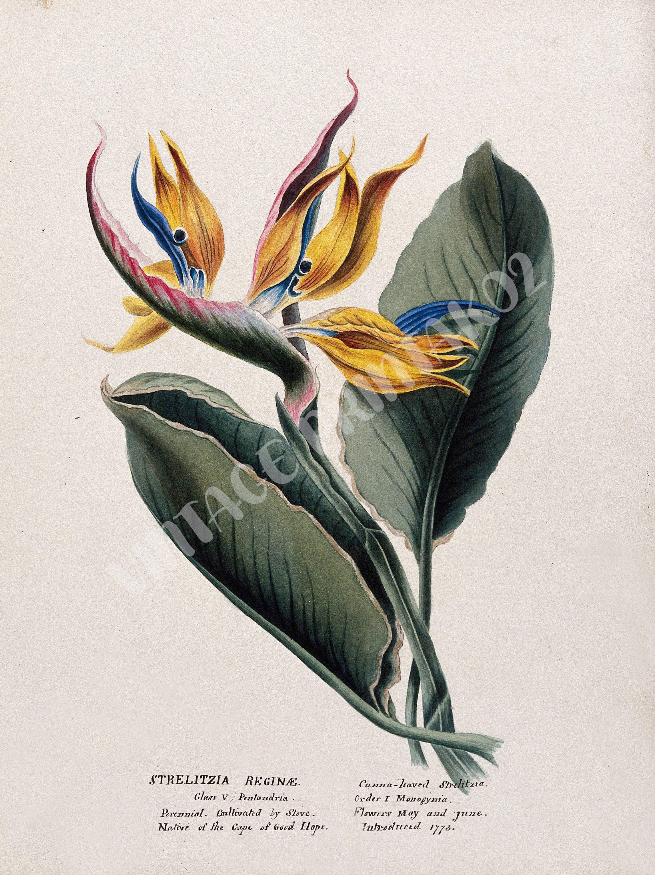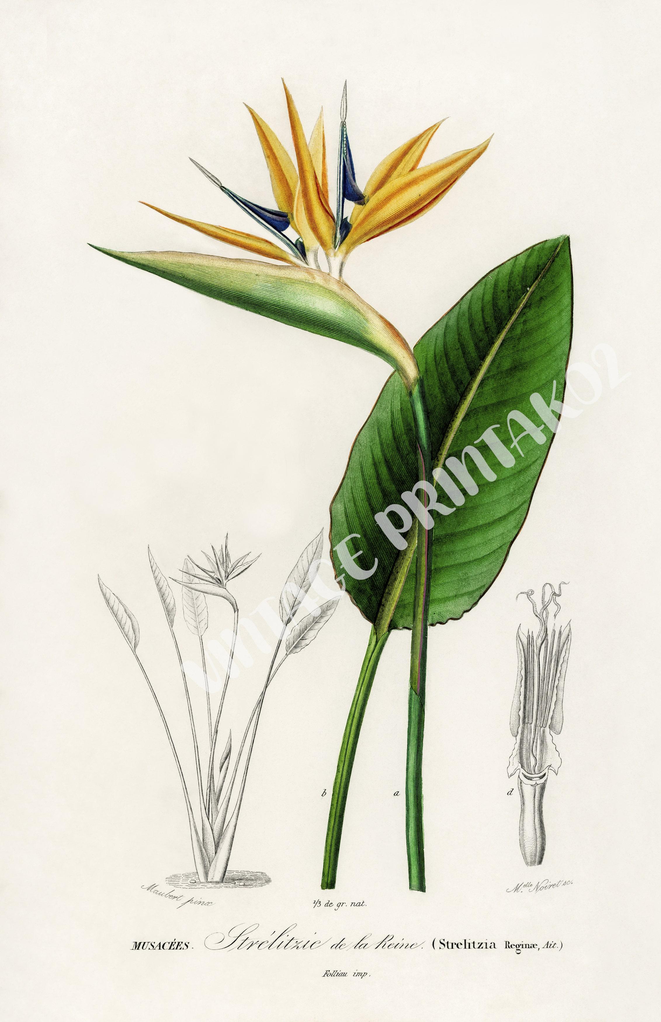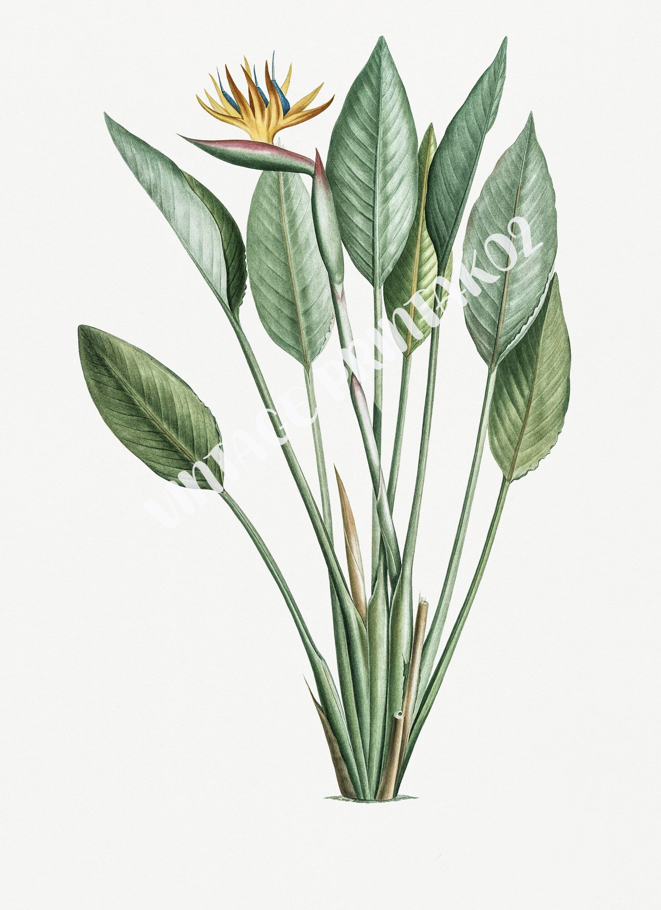 - Painting is a vibrant and detailed depiction of Bird of Paradise flowers (Strelitzia), showcasing their exotic beauty. The main focus is on the Bird of Paradise flowers, with their distinctive bright orange and yellow petals, and purple and blue accents. The flowers are depicted in full bloom, showcasing their intricate and striking structure.